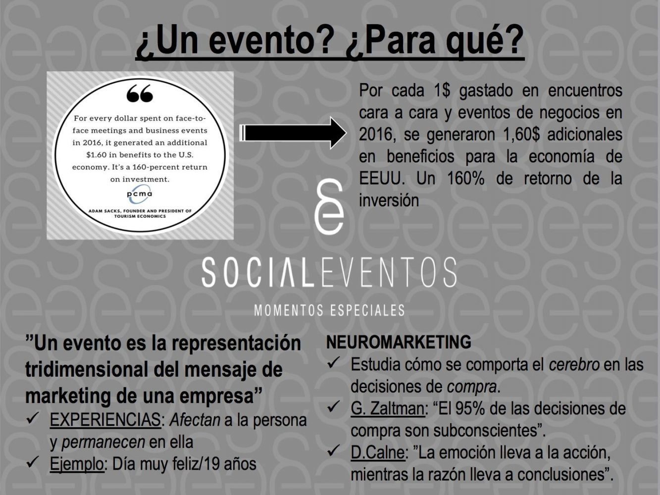 No vamos a explicaros aquí todo lo que hemos dicho en la reunión, pero sí nos parece interesante contaros la diapositiva con la que hemos comenzado la charla: «¿Un evento? ¿Para qué?», es decir, ¿por qué iba a estar interesada mi empresa en organizar un evento?